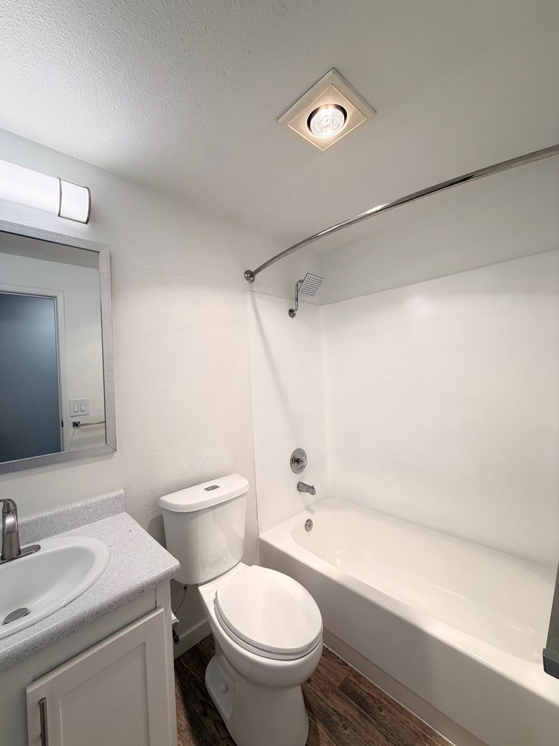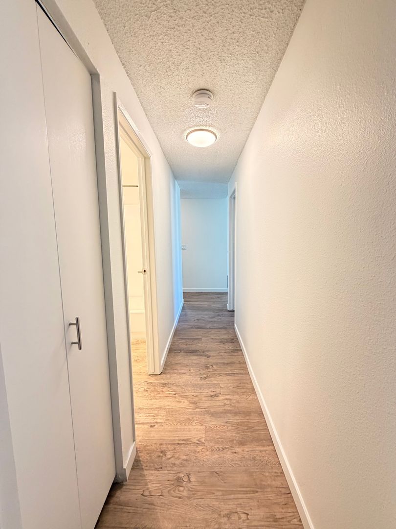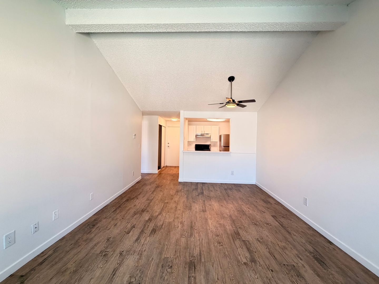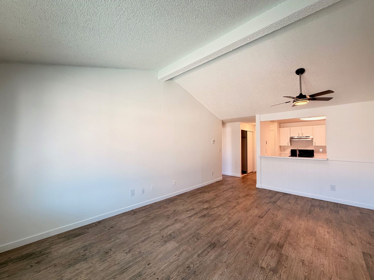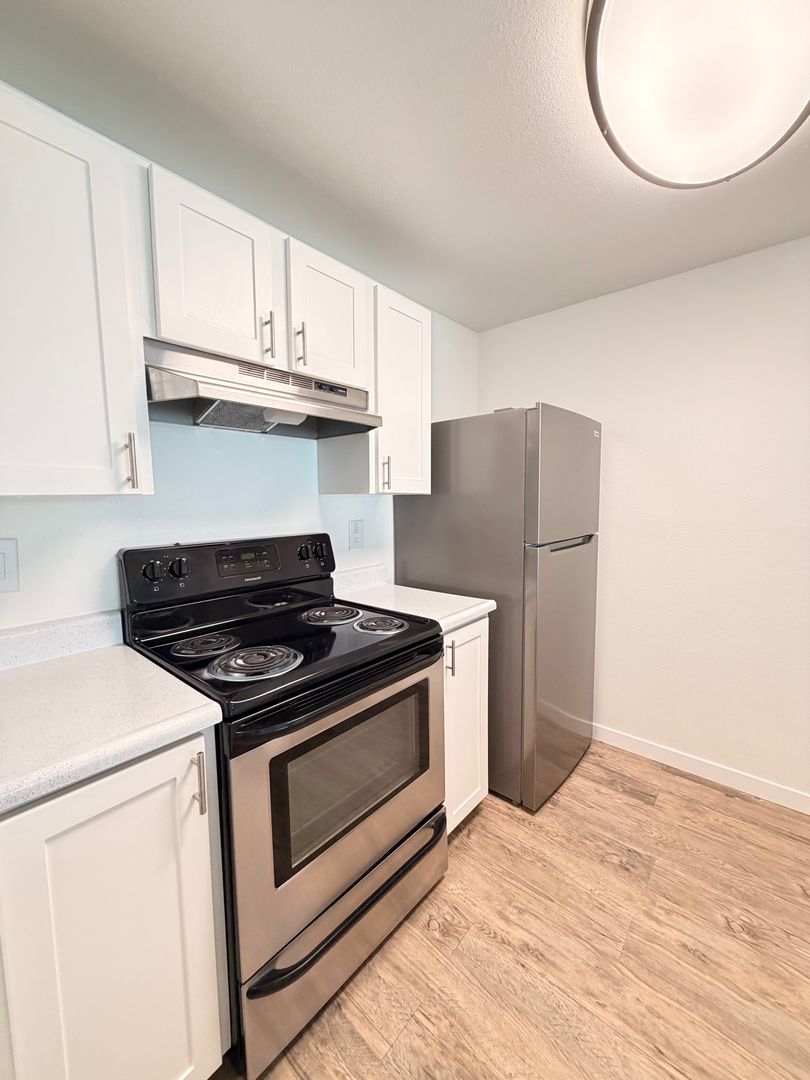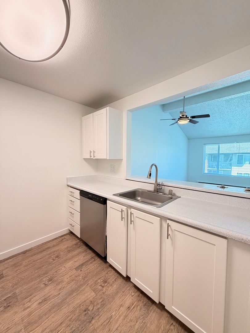 This beautifully updated two bedroom home features designer vaulted ceilings, designer hardwood style flooring throughout, a fully equipped kitchen with stainless steel appliances, pantry closet, a dining area with overhead ceiling fan, spacious bedrooms and one full bathroom.