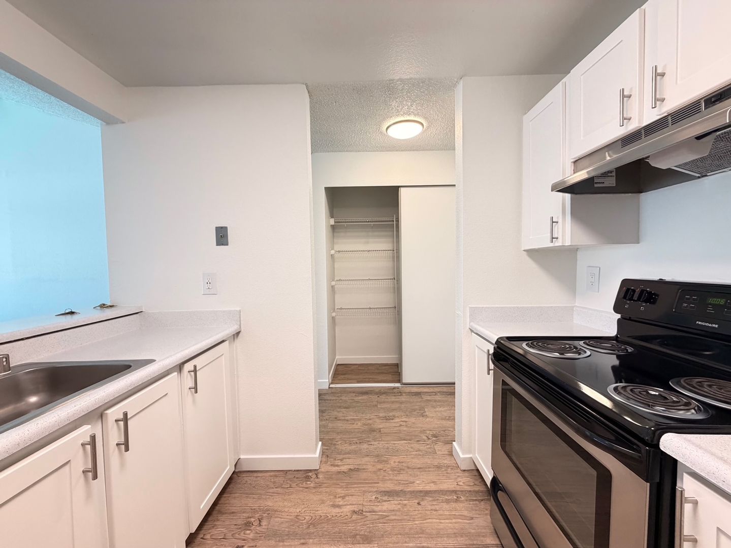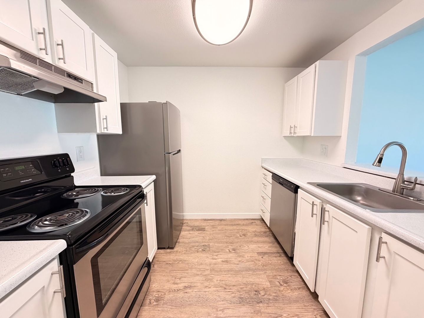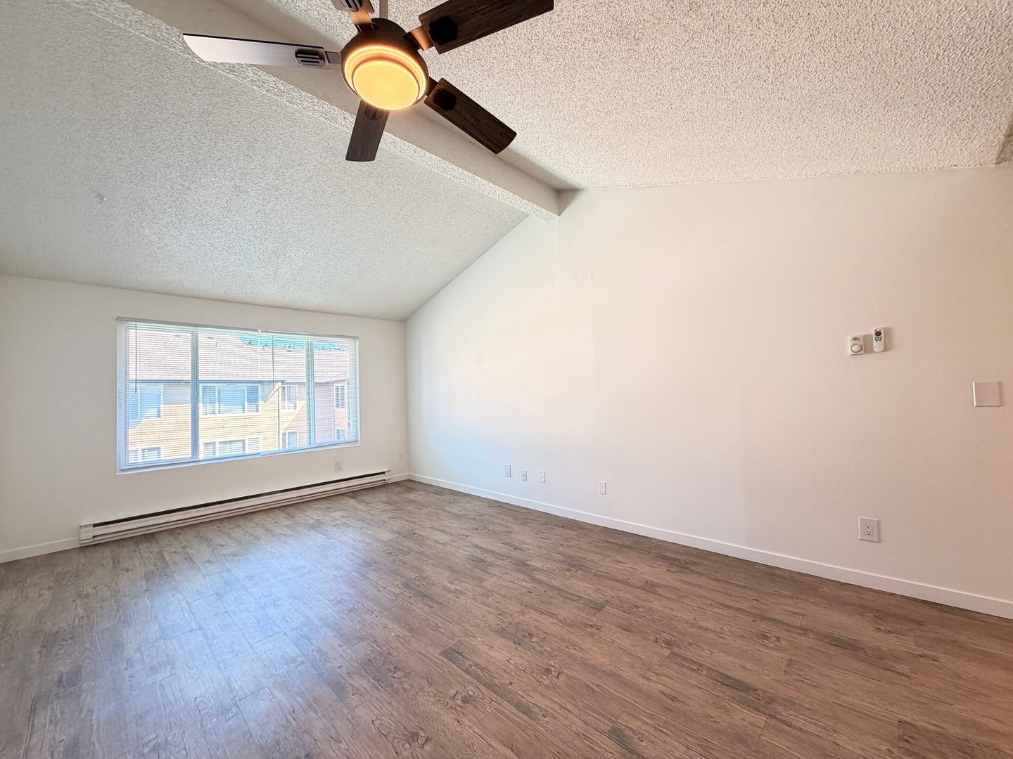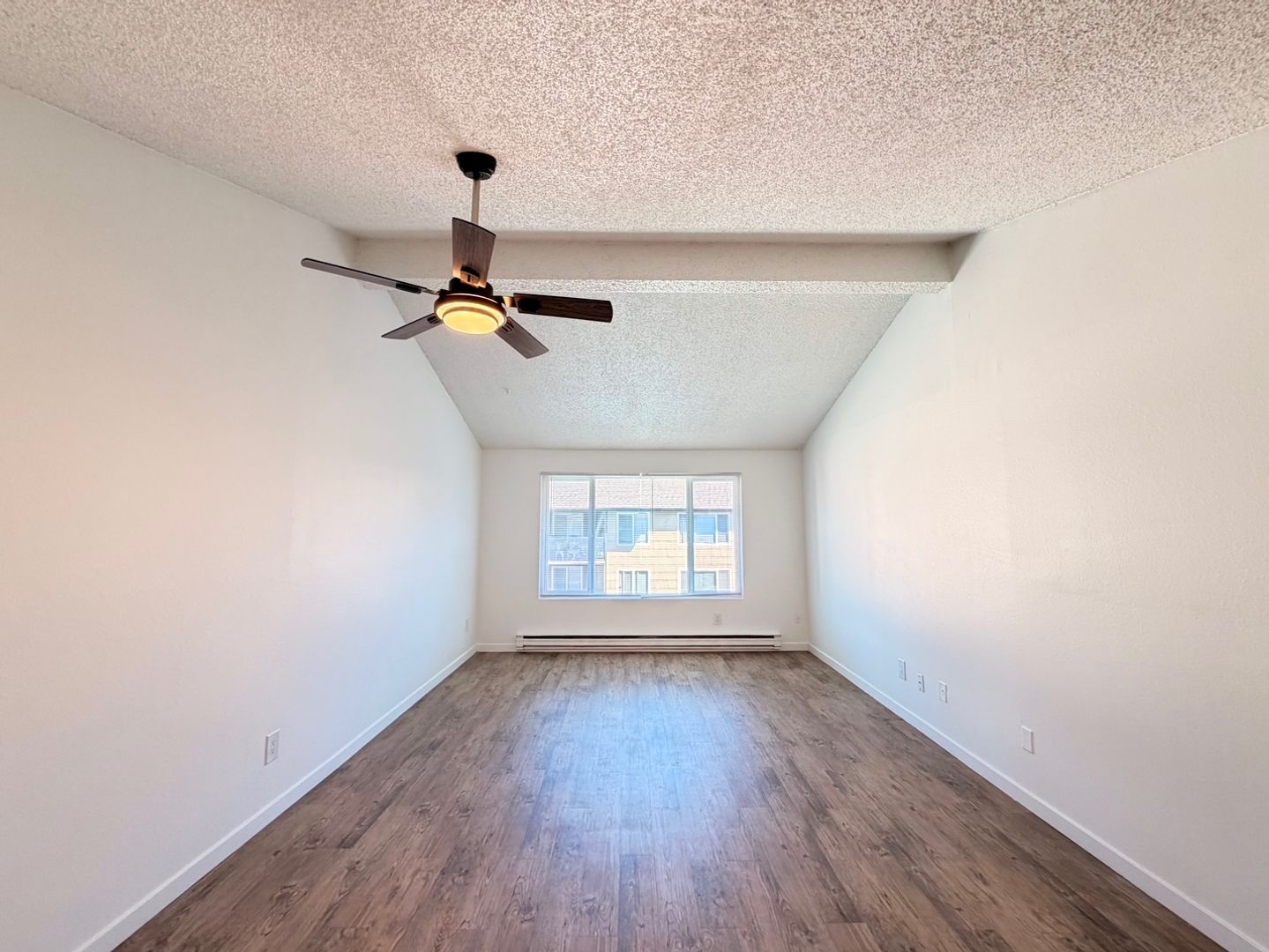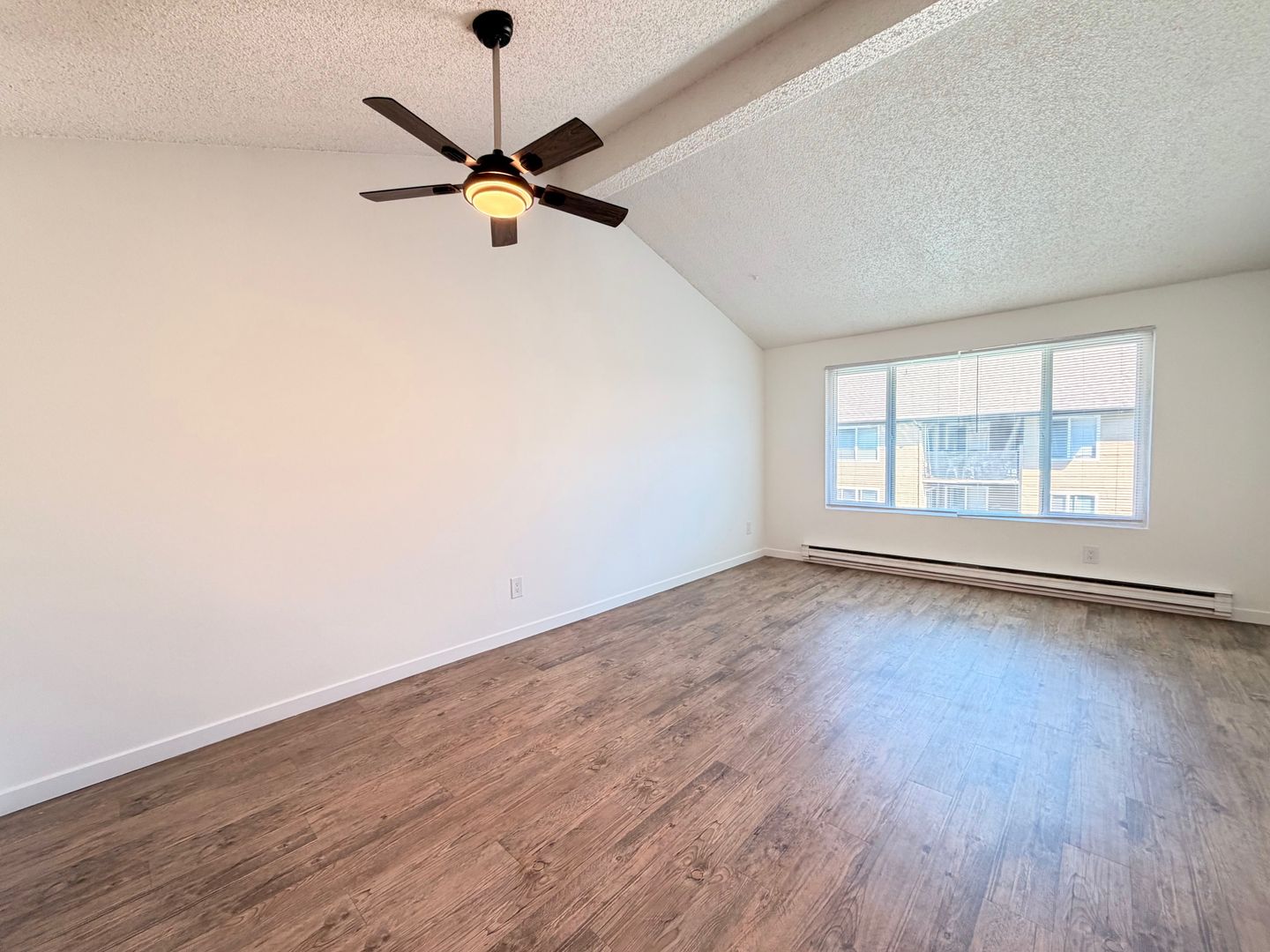 This beautifully updated two bedroom home features designer vaulted ceilings, designer hardwood style flooring throughout, a fully equipped kitchen with stainless steel appliances, pantry closet, a dining area with overhead ceiling fan, spacious bedrooms and one full bathroom.