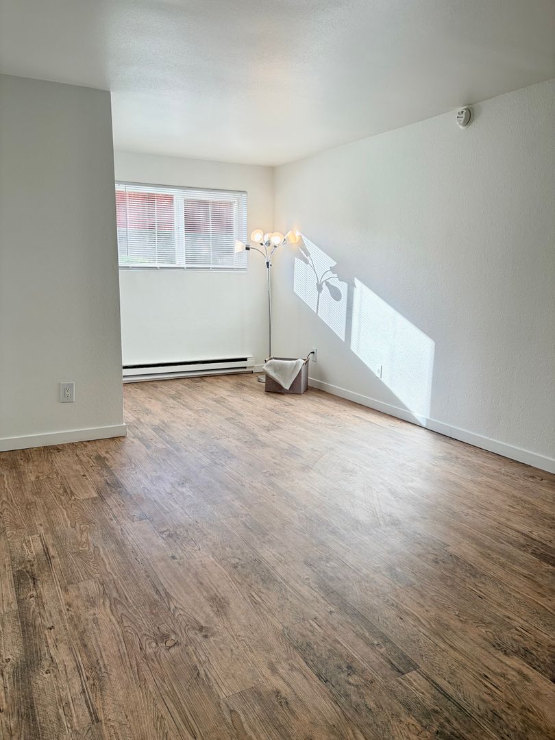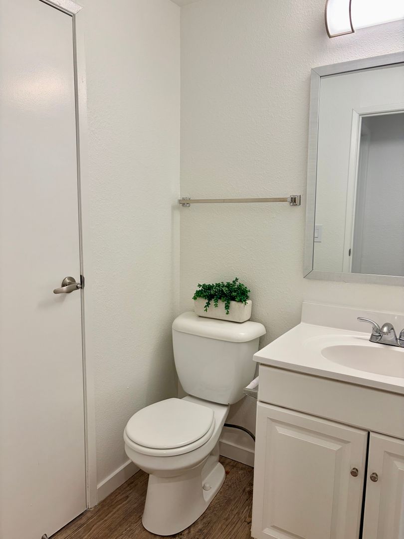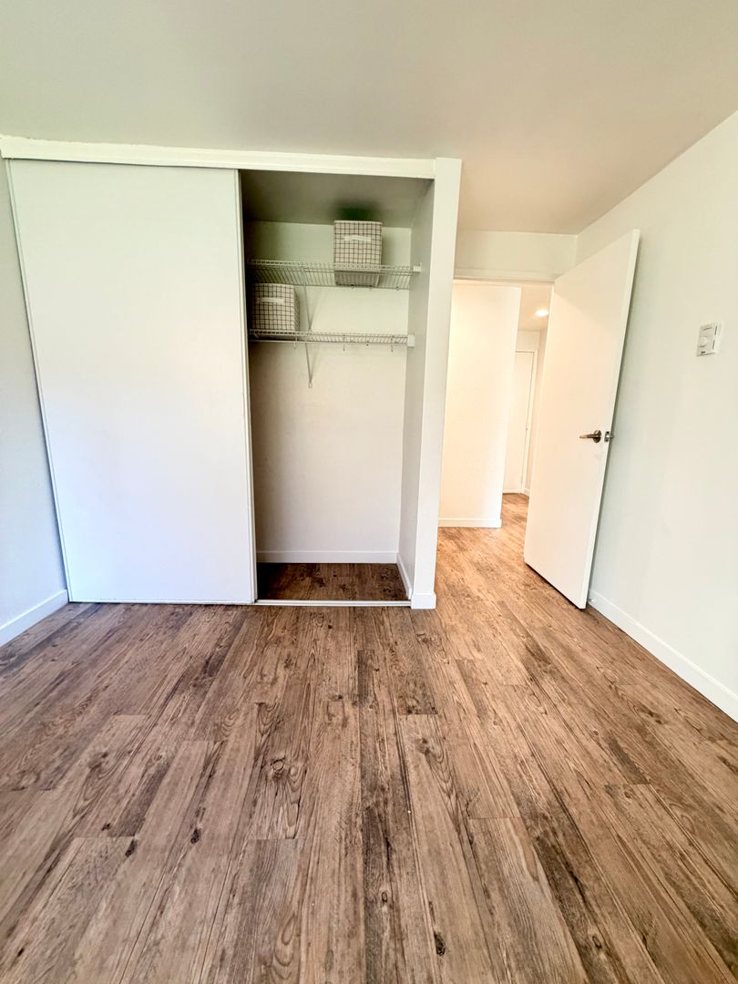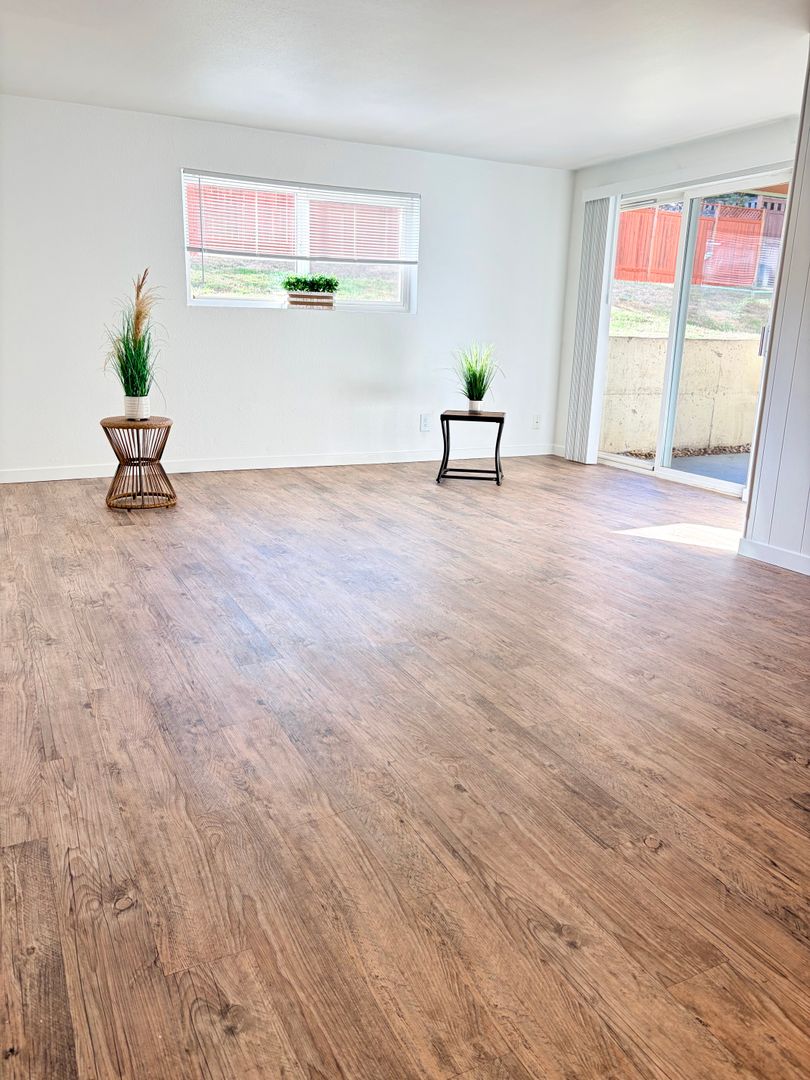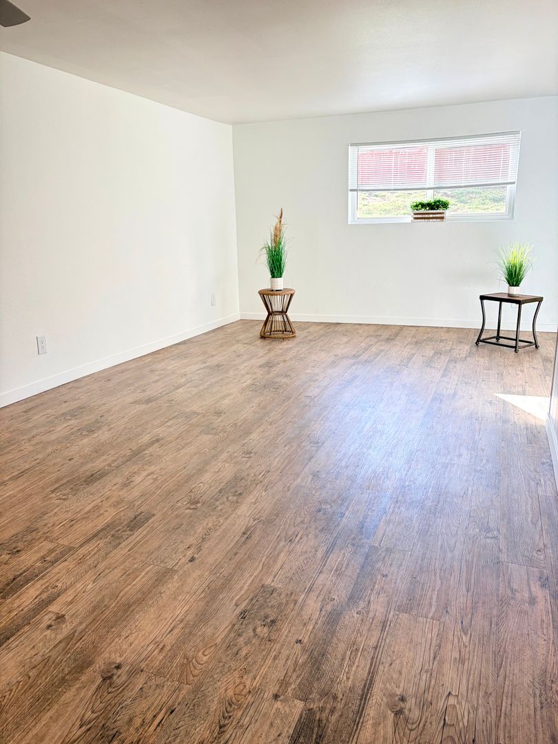 This updated two bedroom home features designer hardwood style flooring throughout, a fully equipped kitchen with stainless steel appliances, a pantry closet, a dining area with overhead ceiling fan, spacious bedrooms, an extra large primary bedroom with over sized grand closet closet, one and a quarter bathrooms and a large private patio.